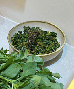 - Add in tandalja bhaji and cook for 2 minutes.