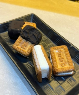 - Place the slice of ice-cream in between the biscuits like a sandwich.